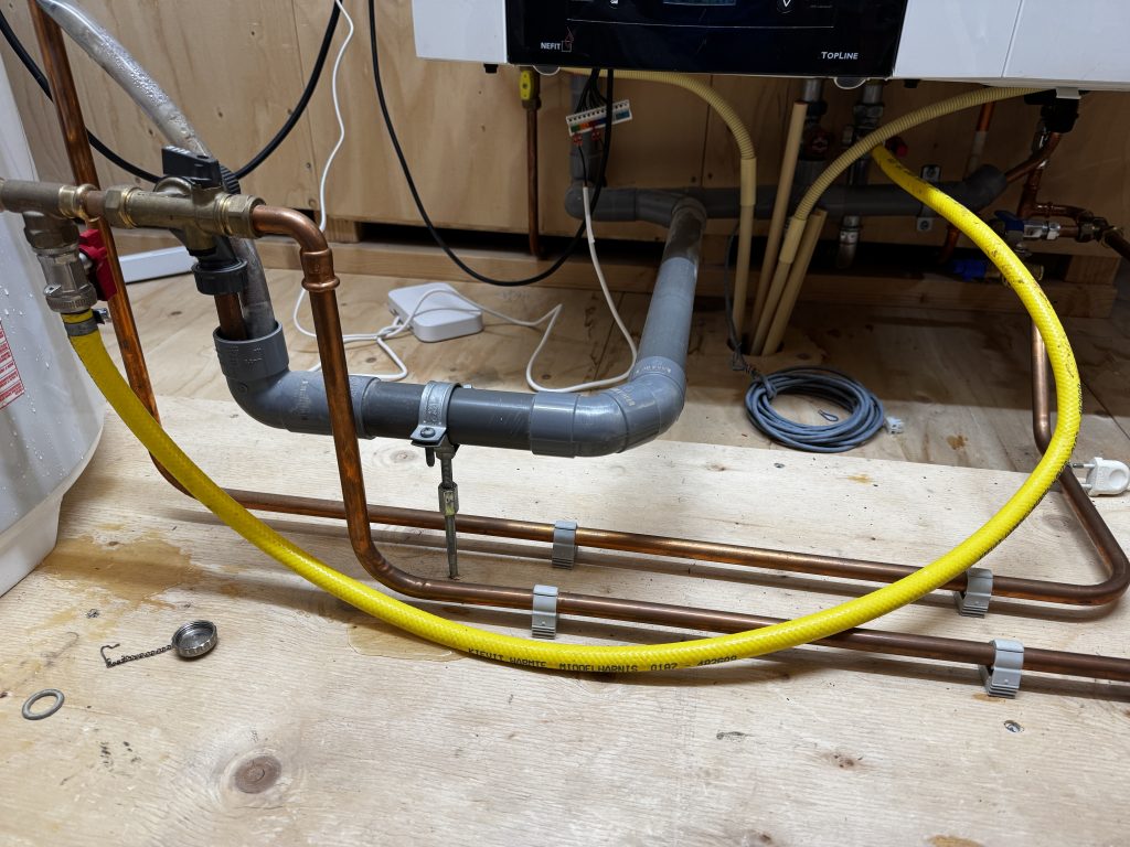 Ja een CV systeem zonder water om rond te pompen wordt hem niet. Na enig zoek een hele korte vulslang gevonden. Dit was een prima indicatie om de aansluitingen op de CV ketel en op de normale waterleiding te vinden